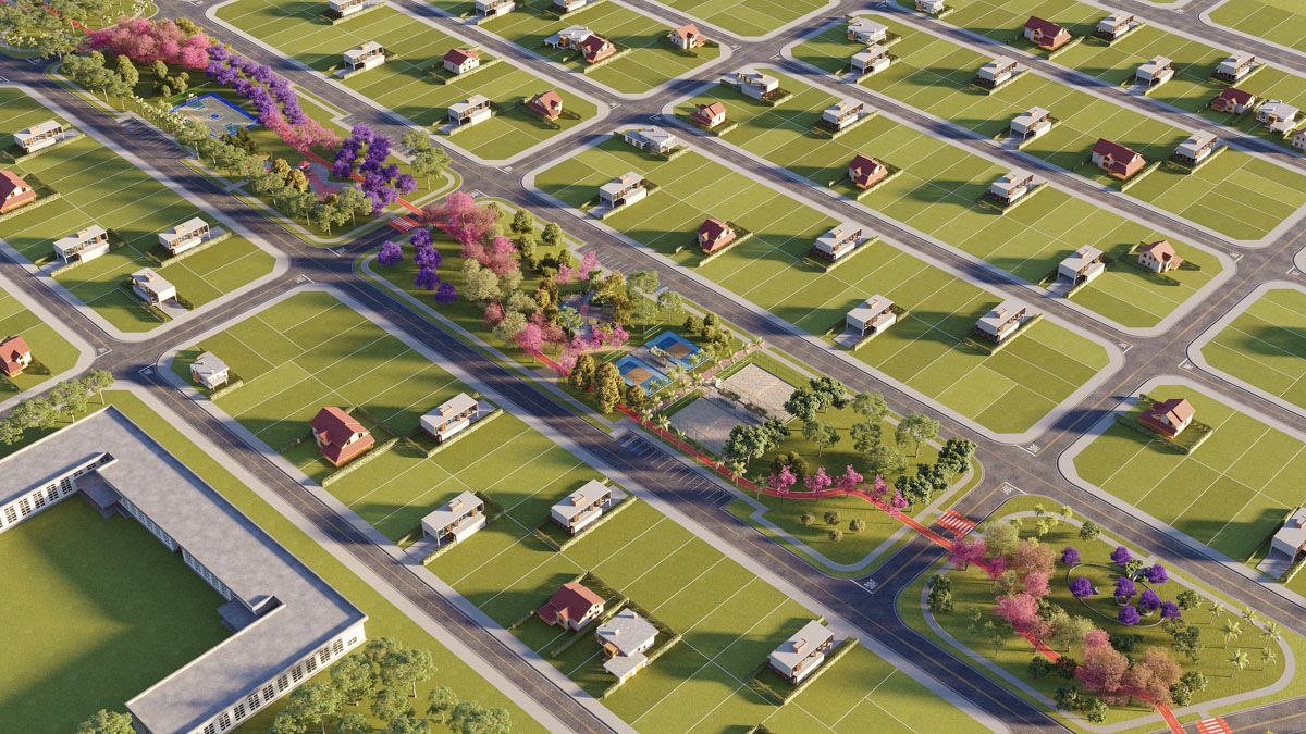 Loteamentos com infraestrutura completa: asfalto com meio-fio, redes de água, esgoto, iluminação pública em LED, galerias de drenagem e câmeras de monitoramento.